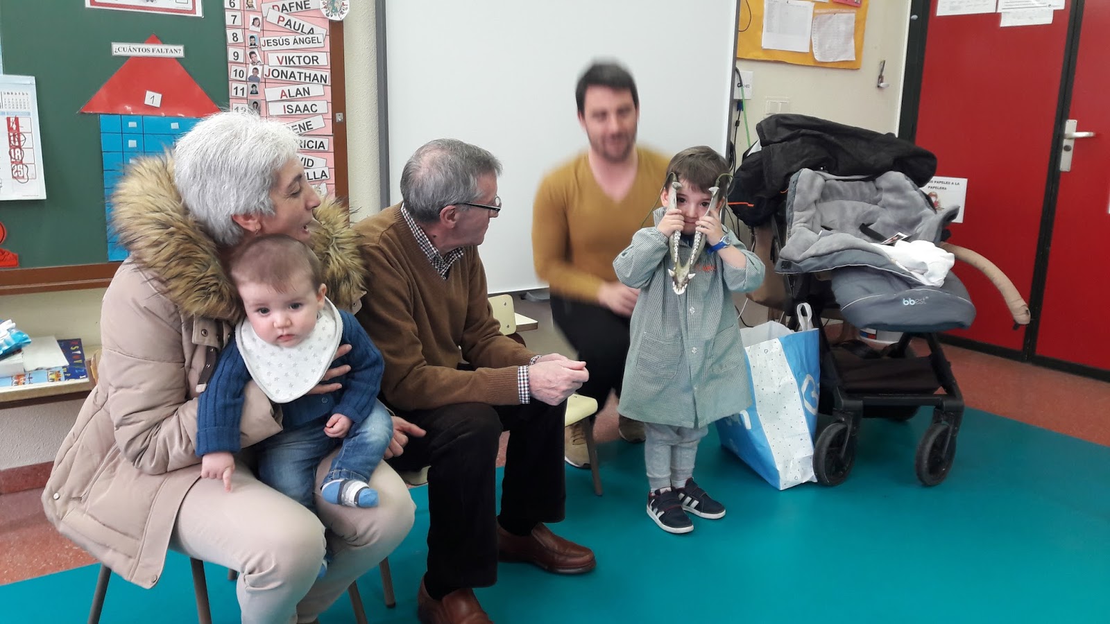Esta mañana hemos recibido la visita de la familia de Carlos, su papá, su abuela, su hermanito Gabriel y hasta su tío abuelo!Estaba Carlos todo contento. Lo primero que han hecho ha sido enseñarnos fotos de cuando Carlos era pequeño, de sus visitas al pueblo de sus abuelos, jugando....y después las han pegado en el super libro de la clase. También nos han dejado tocar un poquito y con cuidado al pequeño Gabriel.